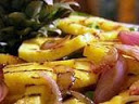 Evenly cut the pineapple into 1/2-inch thick slices. Using a small 1-inch biscuit cutter, pierce a hole into middle of pineapple slices. Brush the pineapple and onion slices with glaze, place on the grill and brush again with glaze. Grill for 2 minutes and flip, grilling other side.