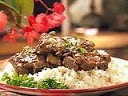 In a Dutch oven, place a small amount of oil. Add the 2 garlic cloves and cook until lightly browned. Add the ribs and brown on each side. Add half water and half beef broth to cover ribs. Bring to a boil. Remove the ribs from the Dutch oven and place in a casserole dish. Add the remaining garlic, salt and pepper, onions, and about 1 cup broth to the ribs. Roast ribs for 2 hours. Serve over buttered white rice.