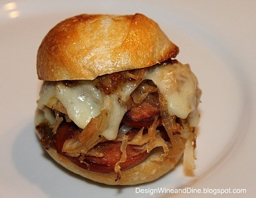 Kielbasa Sandwiches with Grilled Sweet Onions, Sauerkraut, Melted Cheese & Mustard Jalapeno Spread