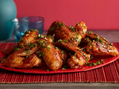 Remove the wings from the oven, if the glaze is not syrupy and thick, place the skillet of wings on the cook top and turn the heat on high, allow the glaze to reduce for about 1 minute. Toss the wings around in the glaze and finish with the fresh cilantro and basil.