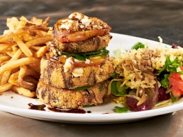 Put the tomato slices on a baking sheet and top each with 1 ounce of the goat cheese. Melt the cheese under the broiler.