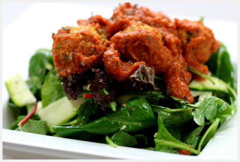 - Mix the polpetta with the salsa, and place even amounts on top of each courgette salad (the pasta strips and leaves, mixed) that you have arranged on the plates.