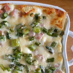 Arrange pasta in 13" x 9" buttered glass pan and spread with 1/4 of the sauce. Top the sauce with 1/4 of the roasted asparagus and sprinkle with 1/3 cup of the Parmesan. Repeat and end with a layer of pasta.