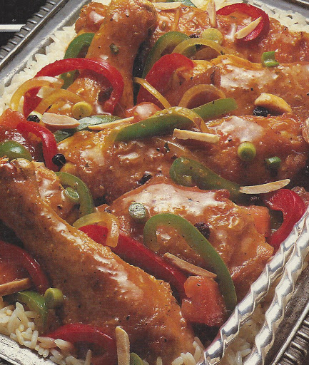 6. Mound rice on platter. Top with chicken. Spoon sauce over. Garnish with remaining green onion. Sprinkle with nuts and currants. Serve.