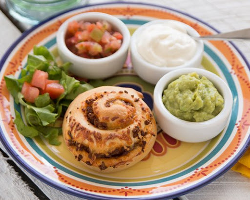 Brown ground beef, drain and add taco seasoning and water. Simmer for 2 or 3 minutes. Cool slightly. Remove wrap from dough and spread evenly with meat mixture. Sprinkle cheese evenly over top of meat. Starting with a long edge roll dough tightly . Cut into 18 1-inch slices.
