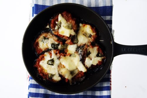 In a 13" x 9" baking dish, arrange as many slices of eggplant as can fit snugly in a single layer. Top each slice with a small spoonful of tomato sauce, a few small pieces of torn mozzarella, a bit of basil and a dusting of parmesan. Continue the layers, evenly distributing all the ingredients, until everything is used up.