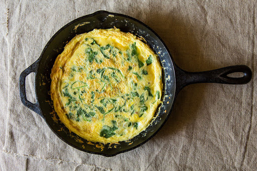 Add the greens and herbs and cook for one minute. Pour the eggs into the skillet, stir gently and cook undisturbed until almost set, about 5 minutes. Put the skillet under the broiler (about 4 inches from the heat) for a couple of minutes, until the eggs have set. Let cool for a few minutes before serving.