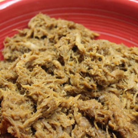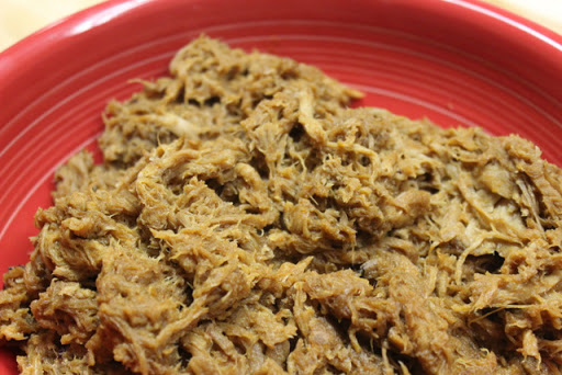 While the sauce is simmering, use two forks to pull the roast apart, shredding pieces of meat off of the roast.