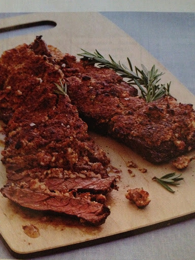 broil the steak until lightly browned, 3-4 minutes. flip it and broil until its cooked nearly to your liking,about 3 miniutes more for mediu, rare. spread the pecan mixture over the steak patting with the back of a spoon to help it adhere. continue broiling until the pecan coating is toasted and fragrant, 1-2 miutes. set the steak aside to rest for 5 minutes. thinly slice the steak against the grain and transfer to plates. if th coating falls off the steak as you are slicing it, spoon it over the top.
