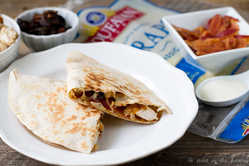 Sprinkle the sun-dried tomatoes, bacon, and additional 2 Tablespoons shredded cheese over half of each of the wraps, then fold them in half.