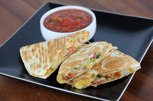 Step 2: Sprinkle half of the cheese evenly over the entire tortilla. On half of the tortilla sprinkle half of the bacon, half of the chicken pieces, and 1 tablespoon of Pico de Gallo. Cook until the cheese has melted and the bottom has browned. Using a spatula fold the tortilla in half and press down the edges gently.