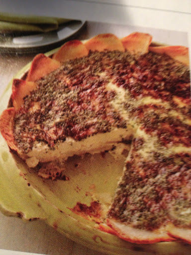 1. Preheat oven to 450 degrees. Slice the potatoes lengthwise into think ovals (using a mandolin if you have one.) Toss with the olive oil and season with salt and pepper, then arrange in a single layer on 2 baking sheets. Bake until tender and pliable, but not brown, 10-15 min. Line the side of a 9 inch pie plate with overlapping potato slices so they stick out above the rim; line the bottom with the remaining slices.