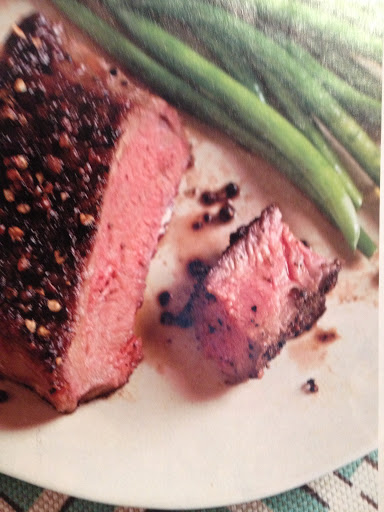1. Heat a large cast-iron skillet over high heat. Pat steaks dry with paper towels; sprinkle steaks evenly with salt. Press peppercorns onto both sides of steaks. Add olive oil to pan; swirl to coat. Add steaks to pan; cook 3 minutes on each side or until desired degree of doneness. Remove steaks from pan; let stand 5 minutes. Cut each steak in half.