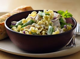 In large bowl, mix dressing, mint, vinegar and salt. Stir in chicken, onion, noodles and peas. Serve immediately, or cover and refrigerate until ready to serve.