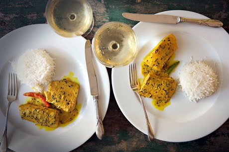 Pour the oil into a medium frying pan and set over medium-high heat. When hot, put in the mustard seeds. As soon as they start to pop, a matter of seconds, add the cumin and fennel seeds. Stir once and quickly pour in the mustard paste. Add the green chilies, stir, and bring to a gentle simmer. Place the fish pieces in the sauce in a single layer. Simmer gently for about 5 minutes, or until the fish is just cooked through, spooning the sauce over the fish all the time.