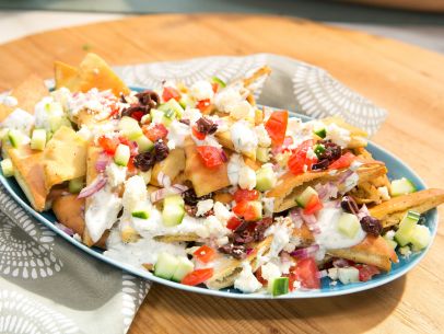 Spoon the yogurt sauce over the pita chips and sprinkle with feta.