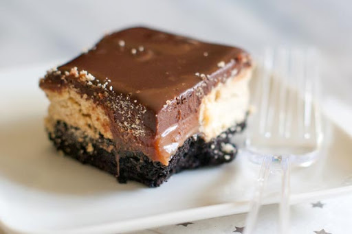 After 25 minutes, remove brownies from oven and top with the cookies, pressing down slightly. Some brownie will still remain visible. Pour caramel sauce evenly over cookies. Return to oven and bake for 5 more minutes.