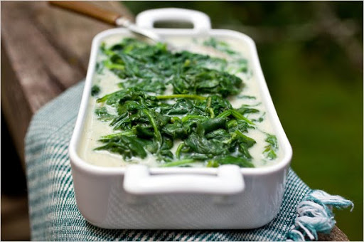• Classic creamed spinach, the kind you’re likely to be served in a restaurant, is rich with cream and butter. But it tastes just as rich when you use olive oil béchamel. This dish makes a terrific accompaniment to fish.