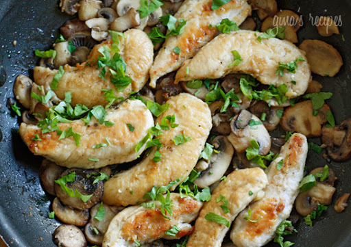 Add wine, chicken broth, parsley; stir the pan with a wooden spoon breaking up any brown bits from the bottom of the pan. Cook a few more minutes or until the liquid reduces by half. Top the chicken with the mushroom sauce and serve.