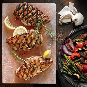 3. Remove chicken from bag; discard marinade. Place chicken on grill rack coated with cooking spray. Place salt slab on top of chicken; grill 5 minutes on each side or until chicken is done. Serve with lemon wedges, if desired.