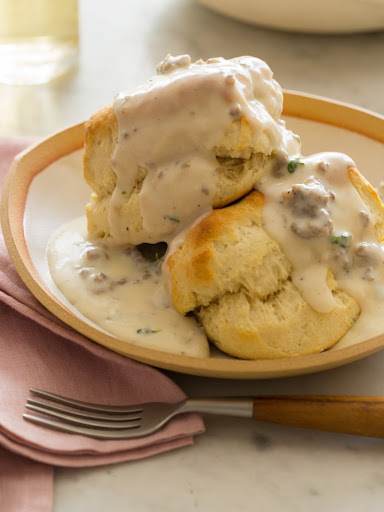12. To serve, place biscuits onto a platter or individual, shallow dishes and cover with sausage gravy. Serve immediately.