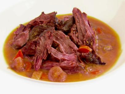 Transfer the beef to a cutting board. Tent with foil and let stand for 15 minutes. Spoon any excess fat off the top of the pan juices. Remove the bay leaves and discard. Using an immersion blender, blend the vegetables and cooking juices together until smooth. (The vegetables can also be pureed in a blender). Season with salt and pepper, to taste. Keep warm over low heat.