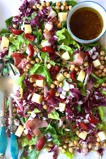 In a large bowl or large platter add romaine, radicchio, garbanzo beans, provolone, red onion, peppers and salami.
