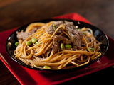 Heat the oil in a skillet or wok over high heat. Add the meat and stir-fry for a couple minutes. Add a liberal amount of coarse black pepper, the scallions, edamame, ginger, and garlic. Stir-fry for 2 minutes more and stir in the teriyaki sauce. Add the stir-fry to the noodles and toss. Serve.