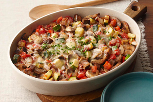 HEAT dressing in large skillet on medium heat. Add onions; cook and stir 5 min. or until tender. Stir in eggplant; cook 5 min., stirring frequently. Add mushrooms, zucchini and peppers; cook and stir 5 min.