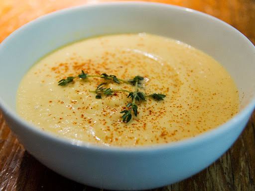 When the cauliflower is soft, puree the soup with an immersion blender.