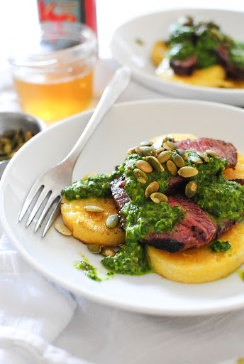 Serve the polenta rounds topped with sliced steak, and a good drizzle of the chimichurri sauce. Garnish with toasted pepitas if ya dare! You should dare.