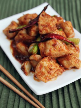 For the stir-fry: Heat a wok over high heat and when the wok starts to smoke, add the vegetable oil. Add the garlic and chicken pieces and let the chicken settle in the wok for 1 minute before stir-frying for another 2 minutes. As the chicken starts to turn opaque, add the rice wine and dried chilies and fry for a few seconds. Then add the sweet sauce mixture and cook for another 3 minutes.