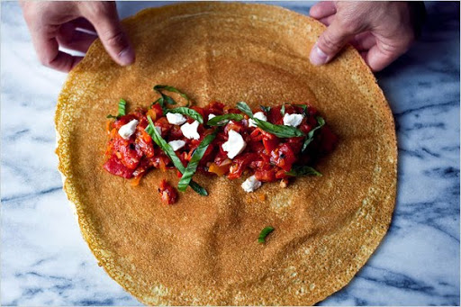 - Chickpea flour crêpes make great wrappers for all sorts of fillings. This savory combination of tomato sauce with roasted pepper and goat cheese is easy to make with ingredients you can keep on hand in the refrigerator and pantry.