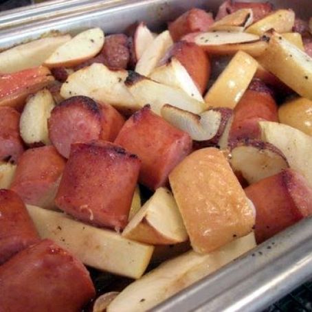 To serve, arrange kielbasa, apples, onions and potatoes on dinner plates and garnish with the pan juices.