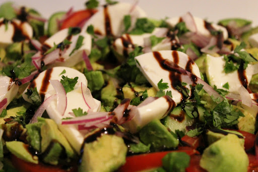 Chop the avocado into cubes and toss with lime juice. Lay butter lettuce leaves on bottom of serving platter. Top with layers of sliced tomato, cucumber and avocado. Place the Bocconcini slices evenly across the top then sprinkle the red onion and cilantro over all.