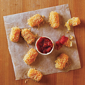 3. Cut mozzarella sticks into 1-inch pieces. Working with one piece at a time, dip cheese in egg substitute; dredge in panko. Place cheese on a baking sheet coated with cooking spray. Bake at 425° for 3 minutes or until the cheese is softened and thoroughly heated.