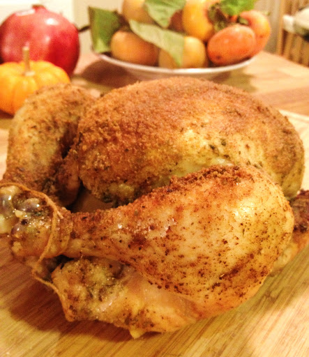 Lay the chicken atop the foil balls and drizzle with a bit of olive oil, rub it over the skin. Now take your spice blend and cover the bird entirely. I like to do this after placing the chicken in the crock so the spices that go overboard end up in the juice and not on my counter.