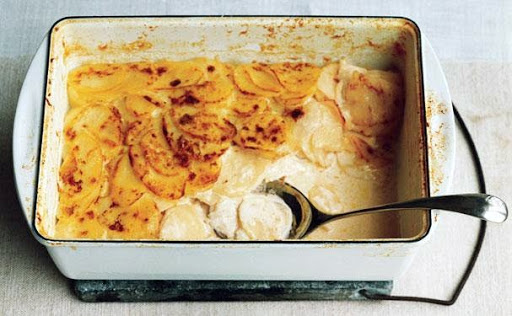 Peel and thinly slice potatoes. Layer potatoes in baking dish, overlapping slightly and sprinkling each layer with some of salt mixture and some of butter.