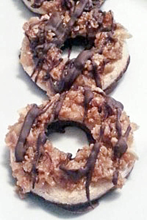 Meanwhile, bring coconut milk, honey and sugar to a boil in a small saucepan. Boil for about 5 minutes or until sugar is dissolved. Remove from heat and stir in coconut flakes. Carefully spoon coconut filling onto cooled cookies. Drizzle with any remaining chocolate sauce and let chill again for about 20 minutes.
