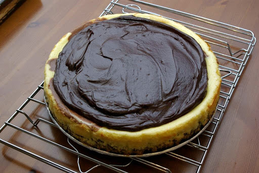For filling in a large bowl beat cream cheese, sugar and eggs on medium speed till fluffy. Spoon half of mixture into pan. Stir melted chocolate into remaining mixture and then drizzle into other mixture. Bake 50 minutes and allow to cool completely. For frosting, mix chocolate and sour cream. Spread over the top and chill briefly to set icing.
