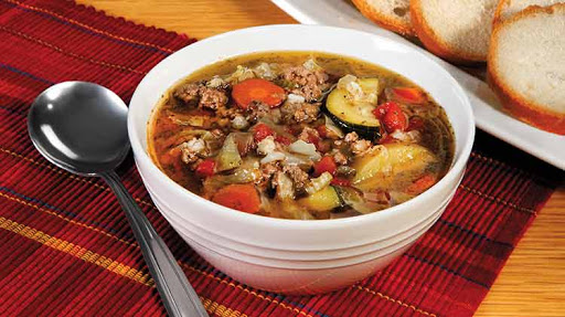 In a stockpot, brown the ground chuck, stirring frequently to break it up, about 10 minutes. Drain well. Add the remaining ingredients and bring to a boil. Reduce the heat and simmer for about an hour until the vegetables have softened and the flavors have blended.