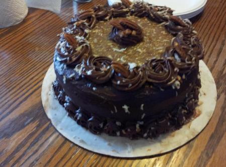 TO ASSEMBLE CAKE: If you baked 2 9" layers slice each layer in 1/2 to make 4 layers or if using 3 8" layers no need to slice. Place bottom layer cut side up on cake plate spread 1 cup of filling over layer to edges. Place next layer cut side down, spread another cup of filling over layer repeat with final 2 layers. On final layer on 8 or 9" cakes use the rest of the filling on the top spread to edges of cake. Ice sides of with whipped ganache.Place ganache in a piping bag with a large star tip and pipe boarder around bottom of cake and rosettes around top of cake and one in center and place reserved pecan halves in rosettes.