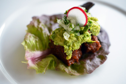 Assemble your own tacos with lettuce leaves, guacamole, diced onions, and cilantro.