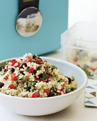 Pour the dressing into a bowl and add the black beans, bell pepper, cilantro and cocktail onions. Scrape the quinoa into the bowl, season with salt and pepper and serve.