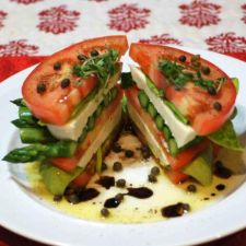 Stack and layer the watermelon, tomato, peach, and mozzarella slices. Garnish with fresh basil and mint leaves.