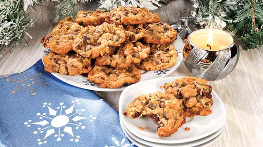 Preheat oven to 375°. Cream together the shortening and sugars. Add the egg, water and VANILLA and mix well. Gradually add the flour, oats, baking soda and salt. Mix well. Fold in the chocolate chips, cranberries, nuts and toffee. Drop by the tablespoon on lightly greased cookie sheets. Bake at 375° for 8-10 minutes or until lightly browned around the edges. Remove from oven and let cool for 5 minutes. Transfer to wire racks to finish cooling.