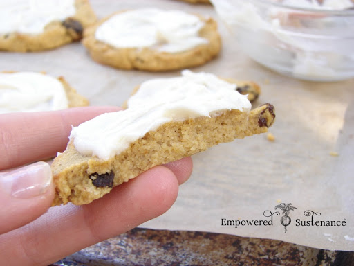 To make the frosting, have the ingredients at room temperature. Stir together until creamy. You may need to add another teaspoon or more of coconut milk for a spreadable frosting. Frost cookies before serving. Cookies and frosting should be stored separately. These cookies freeze relatively well.