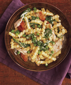 3. Add the cream, chicken, spinach, and ½ teaspoon each salt and pepper to the pot and cook until the chicken is warmed through and the spinach is wilted, 2 to 3 minutes. Add the pasta and peas and toss to combine (add ¼ cup of the reserved cooking water if the pasta seems dry). Serve with the Parmesan.