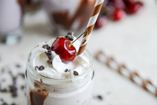 Roasted Cherry Bourbon Milkshakes with Hot Fudge