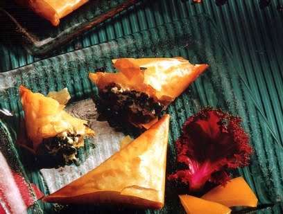 Continue folding triangle sideways and upward (like folding a flag) until end of phyllo strip. Fold end flap over to adhere. Working quickly, form triangles with remaining strips. Repeat with remaining phyllo sheets and filling.